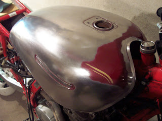 I've spent some time searching for an appropriate fuel tank and finally I bought a pretty nice Kawasaki KZ750 tank. I wasn't expecting it at all, but it turned out that the front mounts fit perfectly :] Now I only need to fabricate a rear mount, get rid of the rest of the paint, apply some graphics and spray everything with a transparent lacquer. I'm psyched!